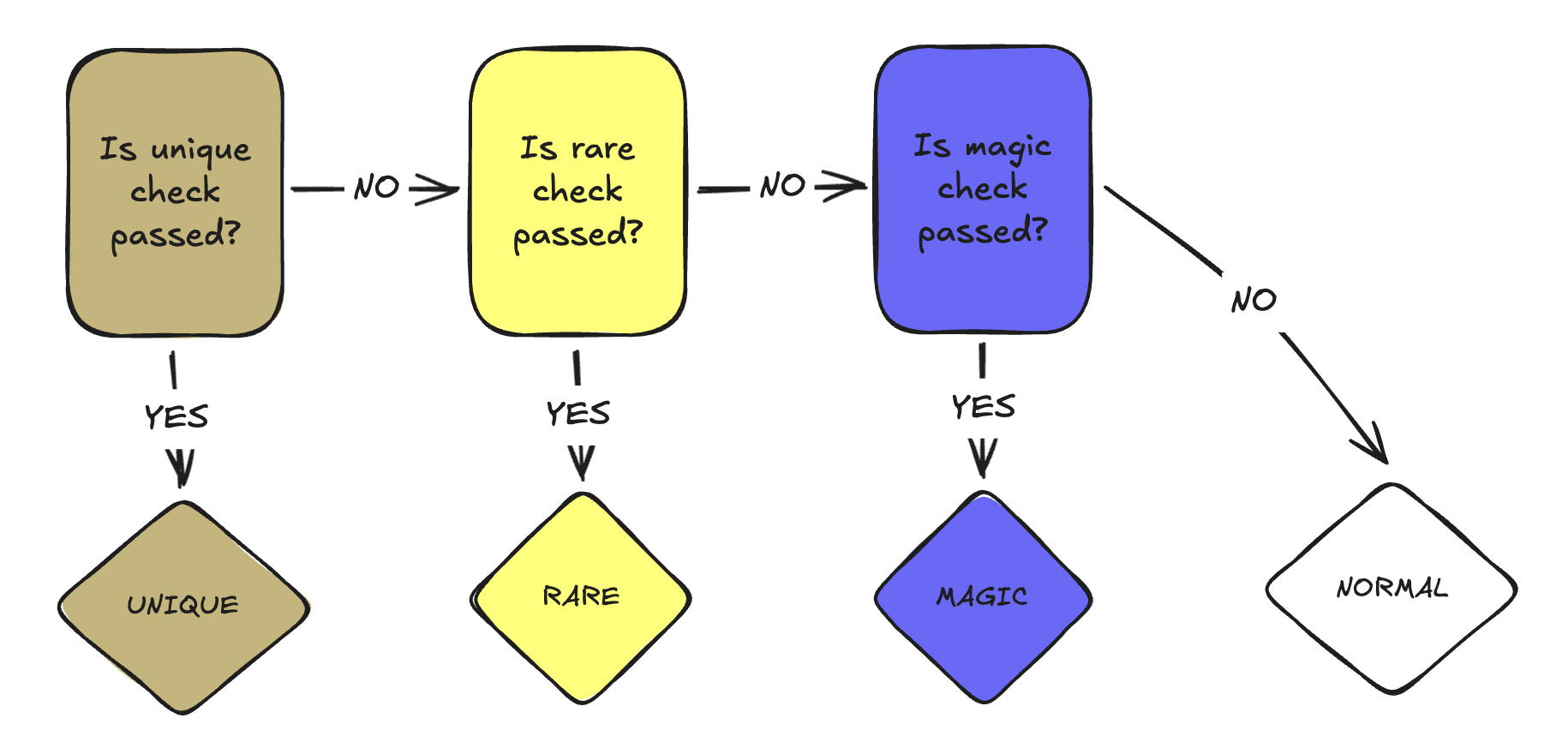 "items": [...]The properties unique, set, rage, and magic are, as you might have guessed, the properties to decide a drop's quality. They are numbers that range from 0 to 1024. After the base type is decided, the game goes back to the starting TC to check the above numbers for the quality deciding process. The check proceeds in the order of unique > set > rare > magic. The game will, from a very complicated formula, use parameters such as iLvl, the base type's qLvl, the character's magic find chance, and the quality number in TC to check. A quality is selected if its respective check is passed.